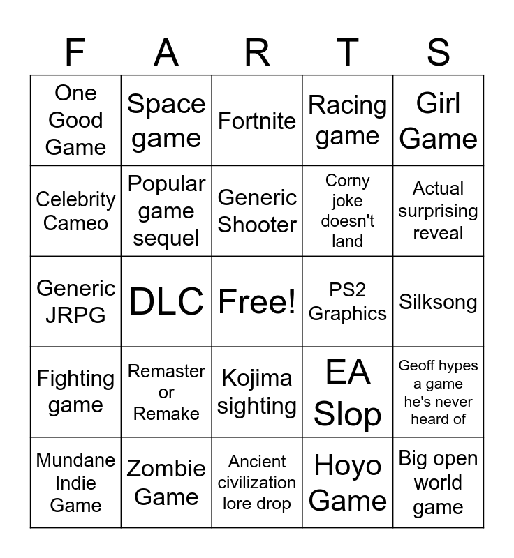 This bingo card has a free space and 24 words: Remaster or Remake, Zombie Game, Generic Shooter, Mundane Indie Game, Girl Game, One Good Game, Celebrity Cameo, Space game, PS2 Graphics, Kojima sighting, Corny joke doesn't land, Generic JRPG, EA Slop, Geoff hypes a game he's never heard of, Popular game sequel, Hoyo Game, Silksong, Fortnite, Actual surprising reveal, DLC, Big open world game, Fighting game, Racing game and Ancient civilization lore drop.