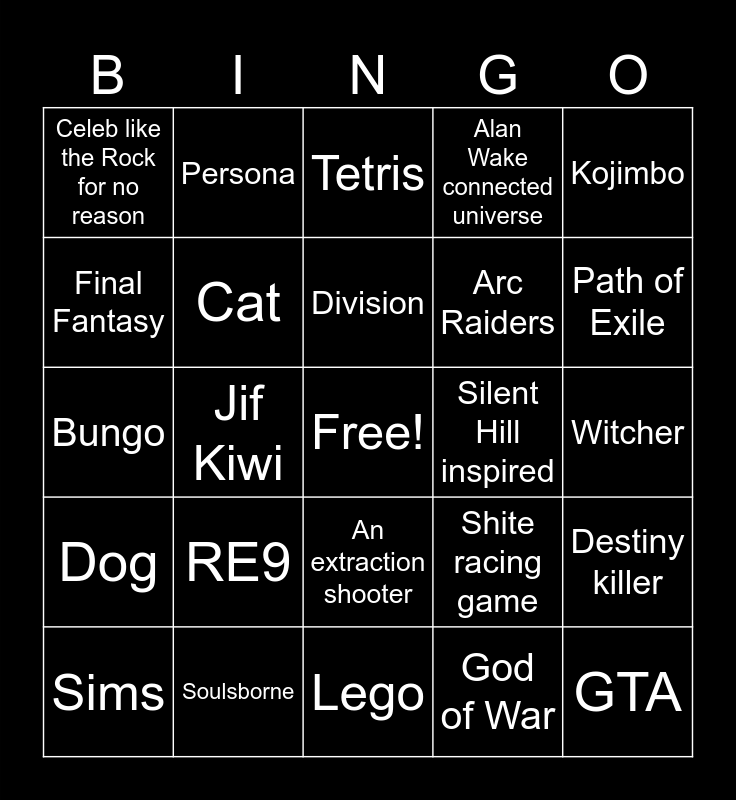 This bingo card has a free space and 24 words: RE9, Soulsborne, Division, Sims, Kojimbo, Celeb like the Rock for no reason, Final Fantasy, Persona, Silent Hill inspired, An extraction shooter, Arc Raiders, Bungo, Shite racing game, Destiny killer, Cat, God of War, Witcher, Tetris, Path of Exile, Jif Kiwi, GTA, Dog, Alan Wake connected universe and Lego.