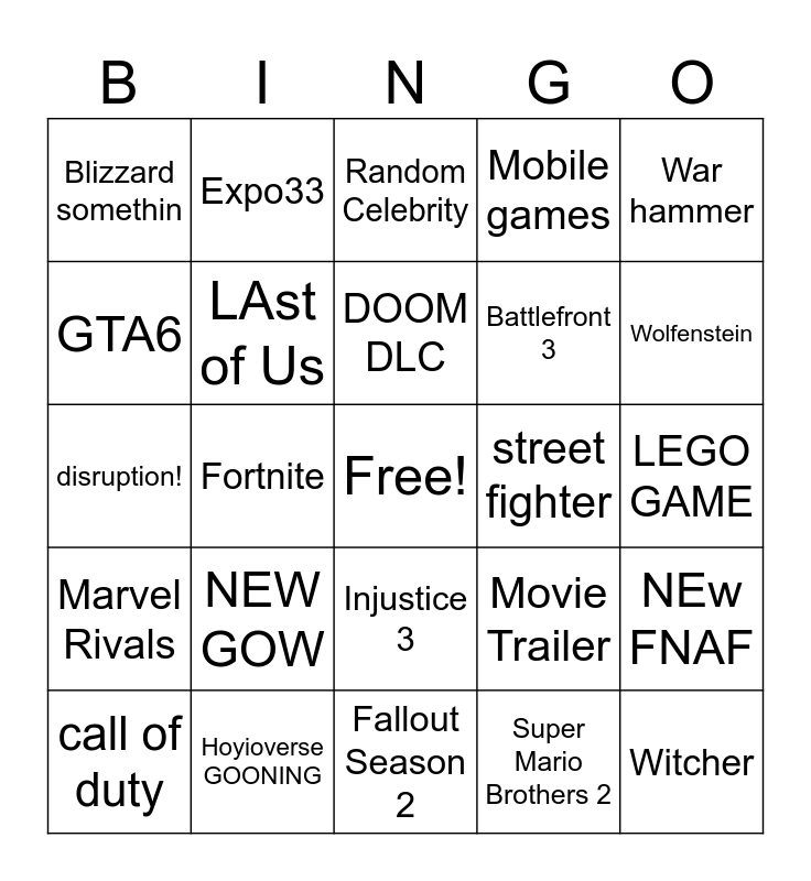 This bingo card has a free space and 24 words: NEW GOW, Hoyioverse GOONING, DOOM DLC, call of duty, War hammer, Blizzard somethin, GTA6, Expo33, street fighter, Injustice 3, Battlefront 3, disruption!, Movie Trailer, NEw FNAF, LAst of Us, Super Mario Brothers 2, LEGO GAME, Random Celebrity, Wolfenstein, Fortnite, Witcher, Marvel Rivals, Mobile games and Fallout Season 2.