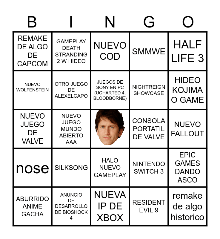This bingo card has a free space and 24 words: SILKSONG, ANUNCIO DE DESARROLLO DE BIOSHOCK 4, JUEGOS DE SONY EN PC (UCHARTED 4, BLOODBORNE), ABURRIDO ANIME GACHA, HALF LIFE 3, REMAKE DE ALGO DE CAPCOM, NUEVO WOLFENSTEIN, GAMEPLAY DEATH STRANDING 2 W HIDEO, CONSOLA PORTATIL DE VALVE, HALO NUEVO GAMEPLAY, NIGHTREIGN SHOWCASE, NUEVO JUEGO DE VALVE, NINTENDO SWITCH 3, EPIC GAMES DANDO ASCO, OTRO JUEGO DE ALEXELCAPO, RESIDENT EVIL 9, NUEVO FALLOUT, NUEVO COD, HIDEO KOJIMA O GAME, NUEVO JUEGO MUNDO ABIERTO AAA, remake de algo historico, nose, SMMWE and NUEVA IP DE XBOX.