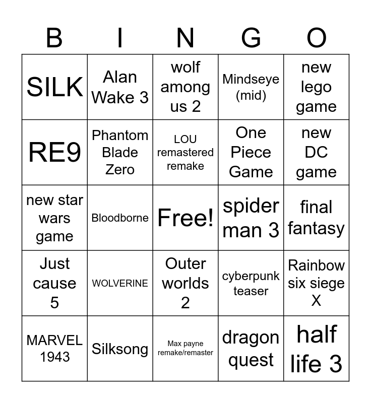This bingo card has a free space and 24 words: WOLVERINE, Silksong, LOU remastered remake, MARVEL 1943, new lego game, SILK, RE9, Alan Wake 3, spider man 3, Outer worlds 2, One Piece Game, new star wars game, cyberpunk teaser, Rainbow six siege X, Phantom Blade Zero, dragon quest, final fantasy, wolf among us 2, new DC game, Bloodborne, half life 3, Just cause 5, Mindseye (mid) and Max payne remake/remaster.