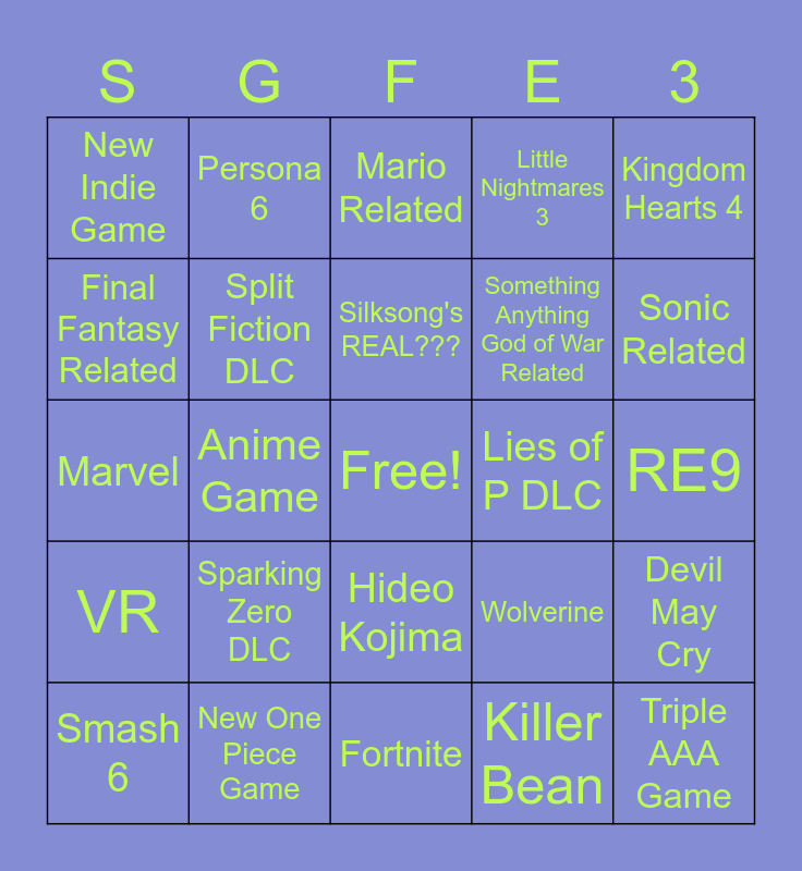 This bingo card has a free space and 24 words: Sparking Zero DLC, New One Piece Game, Silksong's REAL???, Smash 6, Kingdom Hearts 4, New Indie Game, Final Fantasy Related, Persona 6, Lies of P DLC, Hideo Kojima, Something Anything God of War Related, Marvel, Wolverine, Devil May Cry, Split Fiction DLC, Killer Bean, RE9, Mario Related, Sonic Related, Anime Game, Triple AAA Game, VR, Little Nightmares 3 and Fortnite.