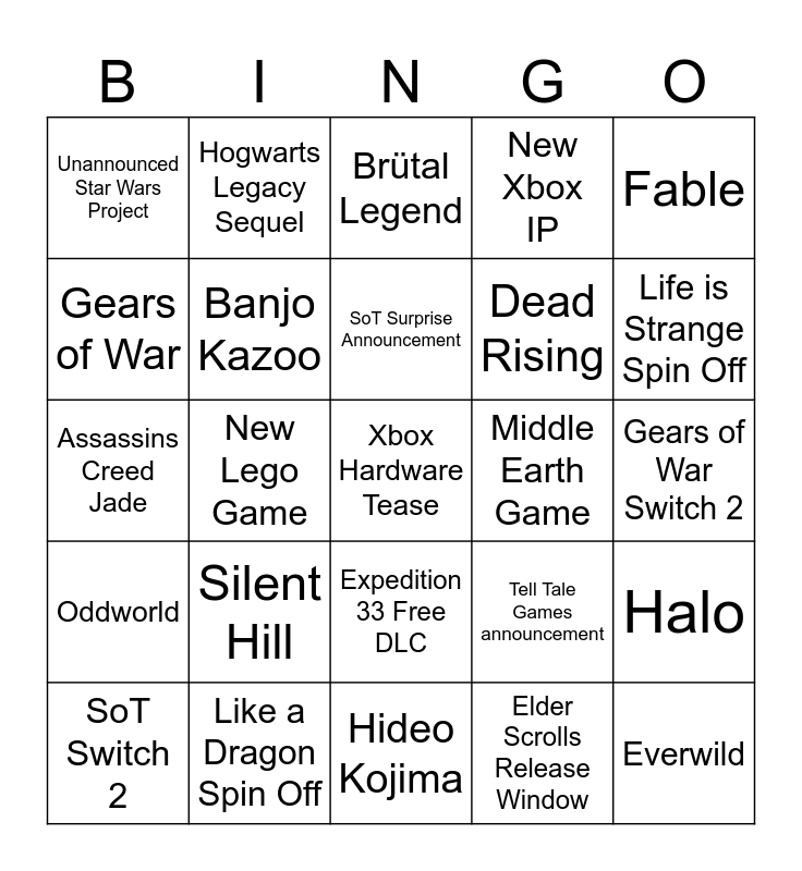 This bingo card has 25 words: Silent Hill, Hideo Kojima, SoT Surprise Announcement, SoT Switch 2, Fable, Unannounced Star Wars Project, Gears of War, Hogwarts Legacy Sequel, Middle Earth Game, Expedition 33 Free DLC, Dead Rising, Assassins Creed Jade, Tell Tale Games announcement, Halo, Banjo Kazoo, Everwild, Gears of War Switch 2, Brütal Legend, Life is Strange Spin Off, New Lego Game, Xbox Hardware Tease, Like a Dragon Spin Off, Oddworld, New Xbox IP and Elder Scrolls Release Window.