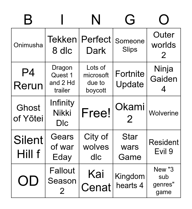 This bingo card has a free space and 24 words: Gears of war Eday, Fallout Season 2, Lots of microsoft due to boycott, OD, Outer worlds 2, Onimusha, P4 Rerun, Tekken 8 dlc, Okami 2, City of wolves dlc, Fortnite Update, Ghost of Yōtei, Star wars Game, Resident Evil 9, Dragon Quest 1 and 2 Hd trailer, Kingdom hearts 4, Wolverine, Perfect Dark, Ninja Gaiden 4, Infinity Nikki Dlc, New "3 sub genres" game, Silent Hill f, Someone Slips and Kai Cenat.