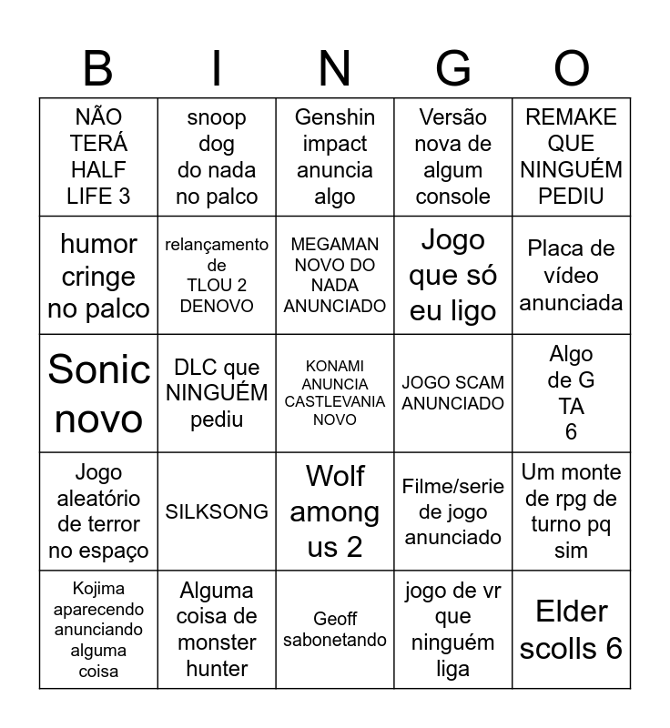 This bingo card has a free space and 24 words: SILKSONG, Alguma coisa de monster hunter, MEGAMAN NOVO DO NADA ANUNCIADO, Kojima aparecendo anunciando alguma coisa, REMAKE QUE NINGUÉM PEDIU, NÃO TERÁ HALF LIFE 3, humor cringe no palco, snoop dog do nada no palco, JOGO SCAM ANUNCIADO, Wolf among us 2, Jogo que só eu ligo, Sonic novo, Filme/serie de jogo anunciado, Um monte de rpg de turno pq sim, relançamento de TLOU 2 DENOVO, jogo de vr que ninguém liga, Algo de GTA 6, Genshin impact anuncia algo, Placa de vídeo anunciada, DLC que NINGUÉM pediu, Elder scolls 6, Jogo aleatório de terror no espaço, Versão nova de algum console and Geoff sabonetando.