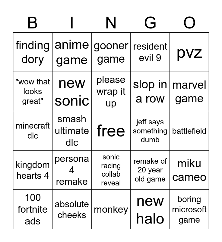 This bingo card has a free space and 24 words: persona 4 remake, absolute cheeks, please wrap it up, 100 fortnite ads, pvz, finding dory, "wow that looks great", anime game, jeff says something dumb, sonic racing collab reveal, slop in a row, minecraft dlc, remake of 20 year old game, miku cameo, new sonic, new halo, battlefield, gooner game, marvel game, smash ultimate dlc, boring microsoft game, kingdom hearts 4, resident evil 9 and monkey.