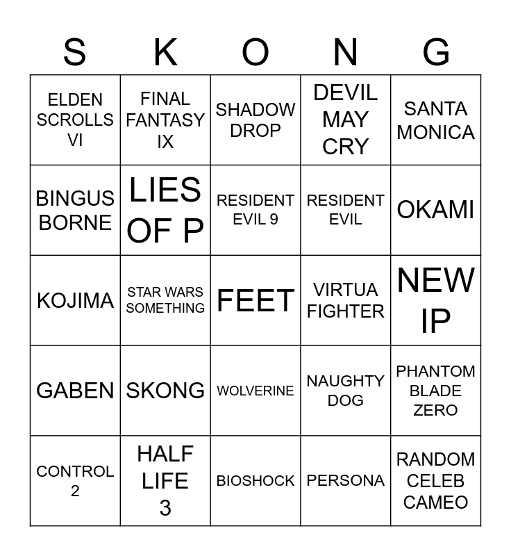 This bingo card has a free space and 24 words: SKONG, HALF LIFE 3, RESIDENT EVIL 9, CONTROL 2, SANTA MONICA, ELDEN SCROLLS VI, BINGUS BORNE, FINAL FANTASY IX, VIRTUA FIGHTER, WOLVERINE, RESIDENT EVIL, KOJIMA, NAUGHTY DOG, PHANTOM BLADE ZERO, LIES OF P, PERSONA, NEW IP, SHADOW DROP, OKAMI, STAR WARS SOMETHING, RANDOM CELEB CAMEO, GABEN, DEVIL MAY CRY and BIOSHOCK.