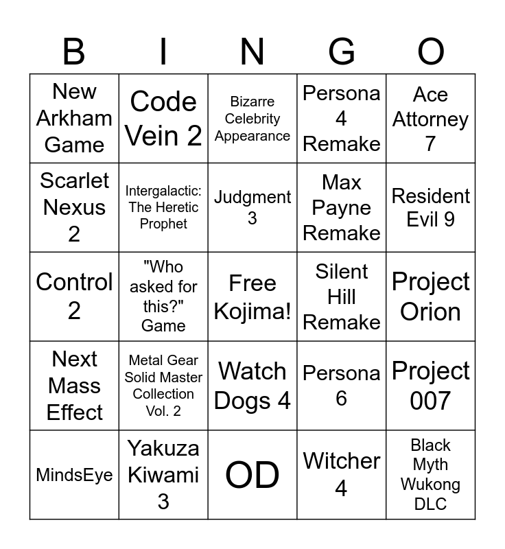 This bingo card has a free space and 24 words: Metal Gear Solid Master Collection Vol. 2, Yakuza Kiwami 3, Judgment 3, MindsEye, Ace Attorney 7, New Arkham Game, Scarlet Nexus 2, Code Vein 2, Silent Hill Remake, Watch Dogs 4, Max Payne Remake, Control 2, Persona 6, Project 007, Intergalactic: The Heretic Prophet, Witcher 4, Project Orion, Bizarre Celebrity Appearance, Resident Evil 9, "Who asked for this?" Game, Black Myth Wukong DLC, Next Mass Effect, Persona 4 Remake and OD.