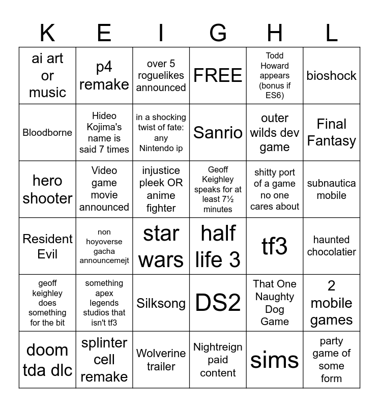 This bingo card has 36 words: DS2, Silksong, Nightreign paid content, Bloodborne, Resident Evil, Geoff Keighley speaks for at least 7½ minutes, Hideo Kojima's name is said 7 times, Wolverine trailer, Todd Howard appears (bonus if ES6), That One Naughty Dog Game, Final Fantasy, FREE, 2 mobile games, Video game movie announced, Sanrio, ai art or music, geoff keighley does something for the bit, shitty port of a game no one cares about, hero shooter, over 5 roguelikes announced, injustice pleek OR anime fighter, non hoyoverse gacha announcemejt, half life 3, star wars, tf3, p4 remake, outer wilds dev game, splinter cell remake, in a shocking twist of fate: any Nintendo ip, bioshock, party game of some form, doom tda dlc, haunted chocolatier, subnautica mobile, something apex legends studios that isn't tf3 and sims.