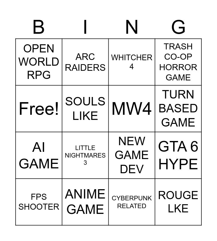This bingo card has 16 words: ANIME GAME, GTA 6 HYPE, WHITCHER 4, OPEN WORLD RPG, AI GAME, ARC RAIDERS, NEW GAME DEV, CYBERPUNK RELATED, Free!, SOULS LIKE, FPS SHOOTER, TRASH CO-OP HORROR GAME, LITTLE NIGHTMARES 3, TURN BASED GAME, MW4 and ROUGE LKE.