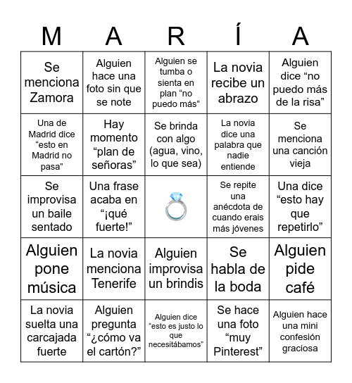 This bingo card has a free space and 25 words: La novia menciona Tenerife, Alguien dice “esto es justo lo que necesitábamos”, Se brinda con algo (agua, vino, lo que sea), La novia suelta una carcajada fuerte, Alguien dice “no puedo más de la risa”, Se menciona Zamora, Una de Madrid dice “esto en Madrid no pasa”, Alguien hace una foto sin que se note, Se repite una anécdota de cuando erais más jóvenes, Alguien improvisa un brindis, La novia dice una palabra que nadie entiende, Se improvisa un baile sentado, Se habla de la boda, Alguien pide café, Hay momento “plan de señoras”, Un desconocido dice “viva la novia”, Una dice “esto hay que repetirlo”, Alguien se tumba o sienta en plan “no puedo más”, Se menciona una canción vieja, Una frase acaba en “¡qué fuerte!”, Alguien hace una mini confesión graciosa, Alguien pregunta “¿cómo va el cartón?”, Alguien pone música, La novia recibe un abrazo and Se hace una foto “muy Pinterest”.