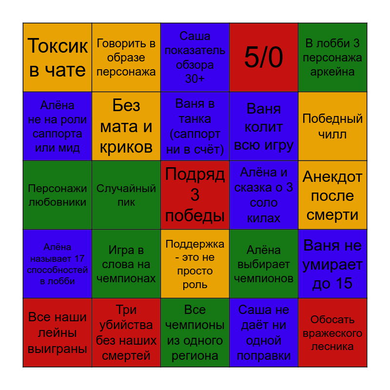 This bingo card has a free space and 24 words: Игра в слова на чемпионах, Три убийства без наших смертей, Ваня в танка (саппорт ни в счёт), Все наши лейны выиграны, В лобби 3 персонажа аркейна, Токсик в чате, Алёна не на роли саппорта или мид, Говорить в образе персонажа, Алёна и сказка о 3 соло килах, Поддержка - это не просто роль, Ваня колит всю игру, Персонажи любовники, Алёна выбирает чемпионов, Ваня не умирает до 15, Без мата и криков, Саша не даёт ни одной поправки, Анекдот после смерти, Саша показатель обзора 30+, Победный чилл, Случайный пик, Обосать вражеского лесника, Алёна называет 17 способностей в лобби, 5/0 and Все чемпионы из одного региона.