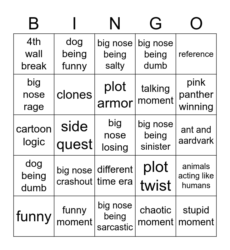 This bingo card has a free space and 24 words: big nose crashout, funny moment, plot armor, funny, reference, 4th wall break, big nose rage, dog being funny, big nose being sinister, different time era, talking moment, cartoon logic, plot twist, animals acting like humans, clones, chaotic moment, ant and aardvark, big nose being salty, pink panther winning, side quest, stupid moment, dog being dumb, big nose being dumb and big nose being sarcastic.