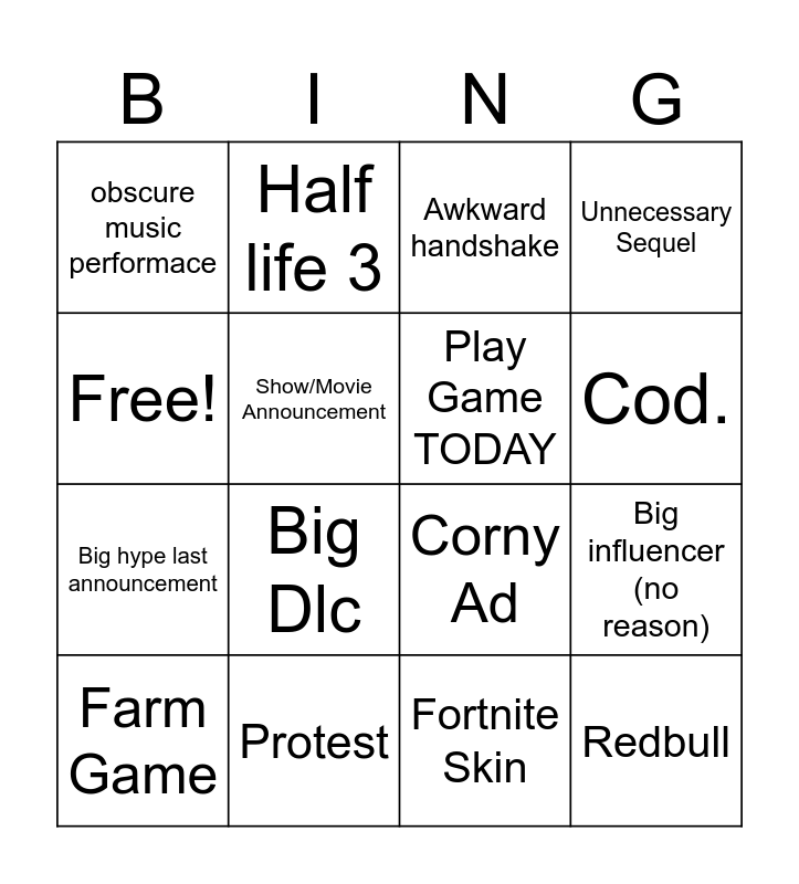 This bingo card has 16 words: Protest, Big influencer (no reason), Awkward handshake, obscure music performace, Big hype last announcement, Half life 3, Corny Ad, Fortnite Skin, Free!, Show/Movie Announcement, Farm Game, Unnecessary Sequel, Big Dlc, Cod., Play Game TODAY and Redbull.