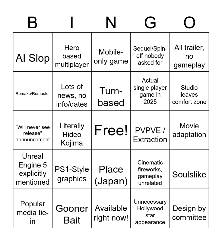 This bingo card has a free space and 24 words: Popular media tie-in, PS1-Style graphics, Turn-based, Unnecessary Hollywood star appearance, All trailer, no gameplay, AI Slop, Hero based multiplayer, Mobile-only game, PVPVE / Extraction, Movie adaptation, "Will never see release" announcement, Lots of news, no info/dates, Cinematic fireworks, gameplay unrelated, Soulslike, Remake/Remaster, Gooner Bait, Available right now!, Sequel/Spin-off nobody asked for, Studio leaves comfort zone, Unreal Engine 5 explicitly mentioned, Literally Hideo Kojima, Place (Japan), Actual single player game in 2025 and Design by committee.