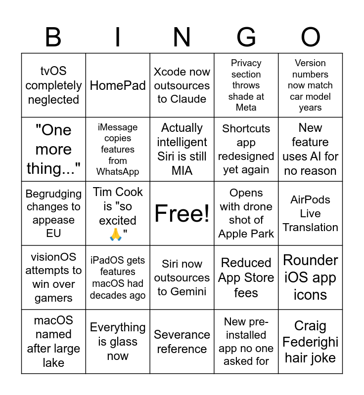 This bingo card has a free space and 24 words: iPadOS gets features macOS had decades ago, Everything is glass now, Actually intelligent Siri is still MIA, macOS named after large lake, Version numbers now match car model years, tvOS completely neglected, "One more thing...", HomePad, Opens with drone shot of Apple Park, Siri now outsources to Gemini, Shortcuts app redesigned yet again, Begrudging changes to appease EU, Reduced App Store fees, Rounder iOS app icons, iMessage copies features from WhatsApp, New pre-installed app no one asked for, AirPods Live Translation, Xcode now outsources to Claude, New feature uses AI for no reason, Tim Cook is "so excited 🙏", Craig Federighi hair joke, visionOS attempts to win over gamers, Privacy section throws shade at Meta and Severance reference.