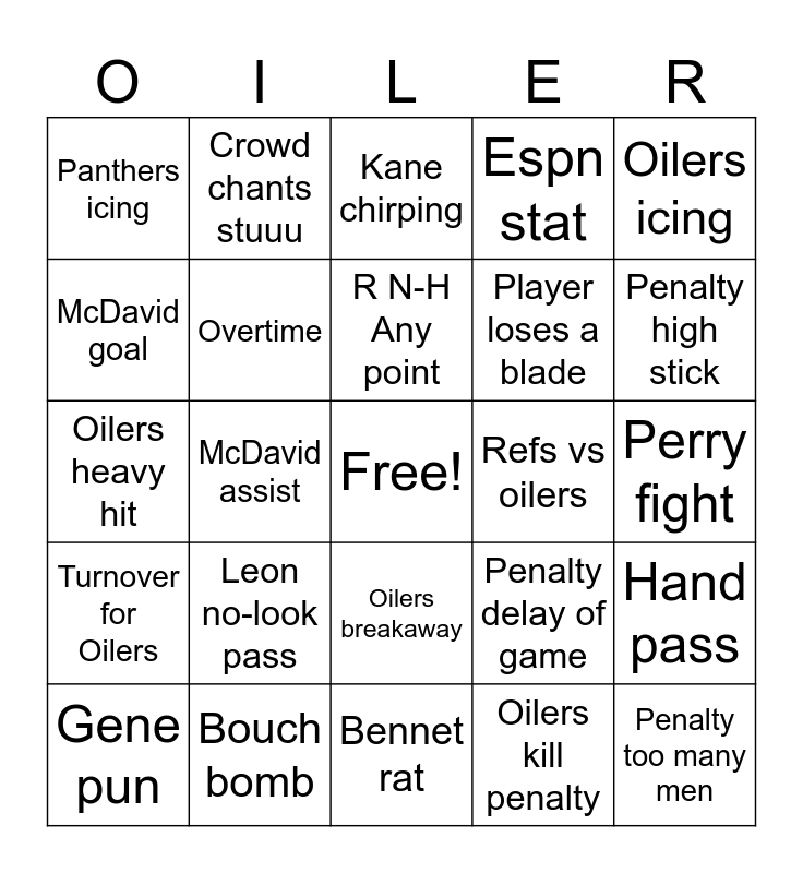 This bingo card has a free space and 42 words: Penalty hooking, R N-H Any point, Penalty interference, Leon no-look pass, Oilers kill penalty, Hand pass, Penalty too many men, Nurse slide, Kane chirping, Oilers breakaway, Perry fight, Penalty high stick, McDavid assist, Oilers icing, Panthers PP goal, Penalty delay of game, Oilers pp goal, Oilers heavy hit, Puck out of play, Crowd chants stuuu, McDavid goal, Oilers offside, Panthers offside, Panthers icing, Crowd boos refs, Broken stick, Player loses a blade, Oilers score first, Penalty slashing, Oilers, Empty net goal, Turnover for Oilers, Overtime, Bennet rat, Kevin argues on the panel, Gene pun, Bouch bomb, Refs vs oilers, Canadian cup drought mentioned, Fourth line goal, Espn stat and Gretzky appearance.