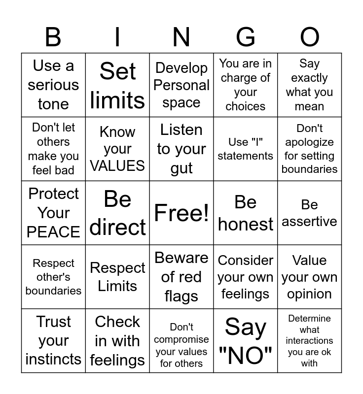 This bingo card has a free space and 24 words: Respect Limits, Check in with feelings, Listen to your gut, Trust your instincts, Say exactly what you mean, Use a serious tone, Don't let others make you feel bad, Set limits, Be honest, Beware of red flags, Use "I" statements, Protect Your PEACE, Consider your own feelings, Value your own opinion, Know your VALUES, Say "NO", Be assertive, Develop Personal space, Don't apologize for setting boundaries, Be direct, Determine what interactions you are ok with, Respect other's boundaries, You are in charge of your choices and Don't compromise your values for others.