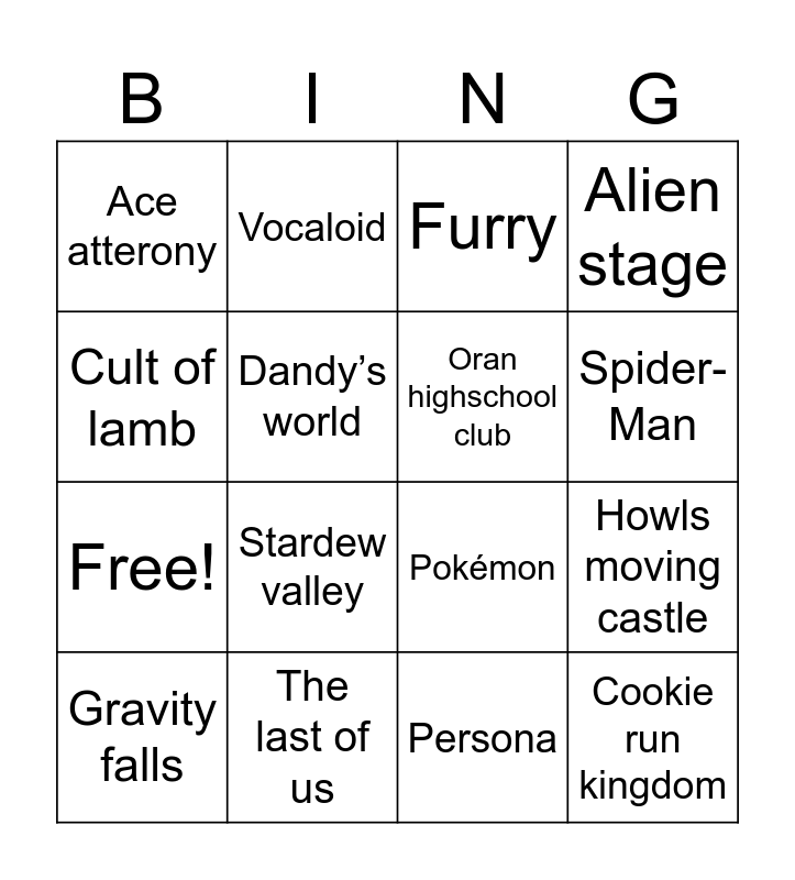 This bingo card has 24 words: Arcane, Mouthwashing, Persona, Cookie run kingdom, Ace atterony, Vocaloid, Oran highschool club, Alien stage, Free!, The last of us, Splatoon, Spider-Man, Sonic, Zelda, Pokémon, Fnaf, Gravity falls, Dandy’s world, Invader zim, Howls moving castle, Cult of lamb, Stardew valley, Furry and Helluva boss.