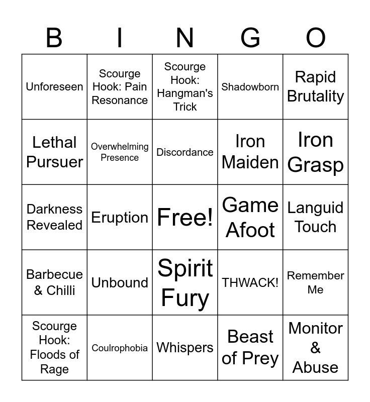 This bingo card has a free space and 127 words: A Nurse's Calling, Agitation, Alien Instinct, All-Shaking Thunder, Awakened Awareness, Bamboozle, Barbecue & Chilli, Batteries Included, Beast of Prey, Bitter Murmur, Blood Echo, Blood Warden, Bloodhound, Brutal Strength, Call of Brine, Corrupt Intervention, Coulrophobia, Coup de Grâce, Cruel Limits, Dark Arrogance, Dark Devotion, Darkness Revealed, Dead Man's Switch, Deadlock, Deathbound, Deerstalker, Discordance, Dissolution, Distressing, Dominance, Dragon's Grip, Dying Light, Enduring, Eruption, Fire Up, Forced Hesitation, Forced Penance, Franklin's Demise, Friends 'til the End, Furtive Chase, Game Afoot, Gearhead, Genetic Limits, Grim Embrace, Hex: Blood Favour, Hex: Crowd Control, Hex: Devour Hope, Hex: Face the Darkness, Hex: Haunted Ground, Hex: Huntress Lullaby, Hex: No One Escapes Death, Hex: Pentimento, Hex: Plaything, Hex: Retribution, Hex: Ruin, Hex: The Third Seal, Hex: Thrill of the Hunt, Hex: Two Can Play, Hex: Undying, Hex: Wretched Fate, Hoarder, Hubris, Human Greed, Hysteria, I'm All Ears, Infectious Fright, Insidious, Iron Grasp, Iron Maiden, Knock Out, Languid Touch, Lethal Pursuer, Leverage, Lightborn, Machine Learning, Mad Grit, Make Your Choice, Merciless Storm, Mindbreaker, Monitor & Abuse, Nemesis, No Quarter, No Way Out, Nowhere to Hide, Oppression, Overcharge, Overwhelming Presence, Play with Your Food, Pop Goes the Weasel, Predator, Rancor, Rapid Brutality, Remember Me, Save the Best for Last, Scourge Hook: Floods of Rage, Scourge Hook: Gift of Pain, Scourge Hook: Hangman's Trick, Scourge Hook: Jagged Compass, Scourge Hook: Monstrous Shrine, Scourge Hook: Pain Resonance, Septic Touch, Shadowborn, Shattered Hope, Sloppy Butcher, Spies from the Shadows, Spirit Fury, Starstruck, Stridor, Superior Anatomy, Surge, Surveillance, THWACK!, Terminus, Territorial Imperative, Thanatophobia, Thrilling Tremors, Tinkerer, Trail of Torment, Ultimate Weapon, Unbound, Undone, Unforeseen, Unnerving Presence, Unrelenting, Weave Attunement, Whispers and Zanshin Tactics.