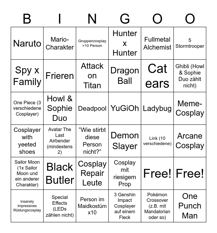 This bingo card has 38 words: Free!, Free!, One Punch Man, Spy x Family, Avatar The Last Airbender (mindestens 2), Ladybug, Frieren, Pokémon Crossover (z.B. mit Mandalorian oder so), Fullmetal Alchemist, Attack on Titan, Ghibli (Howl & Sophie Duo zählt nicht), Hunter x Hunter, One Piece (3 verschiedene Cosplayer), Deadpool, 5 Stormtrooper, YuGiOh, Cosplay Repair Leute, Gruppencosplay >10 Person, Special Effects (LEDs zählen nicht), Howl & Sophie Duo, Naruto, Demon Slayer, Dragon Ball, ”Wie stirbt diese Person nicht?”, Person im Maidkostüm x10, Link (10 verschiedene), Sailor Moon (1x Sailor Moon und ein anderer Charakter), 3 Genshin Impact Cosplayer auf einem Fleck, insanely impressives Rüstungscosplay, Cosplay mit riesigem Prop, Twins (zwei Mal das Gleiche Cosplay nebeneinander), Meme-Cosplay, Arcane Cosplay, Mario-Charakter, Black Butler, Cosplayer with yeeted shoes, Cat ears and Freizügig.