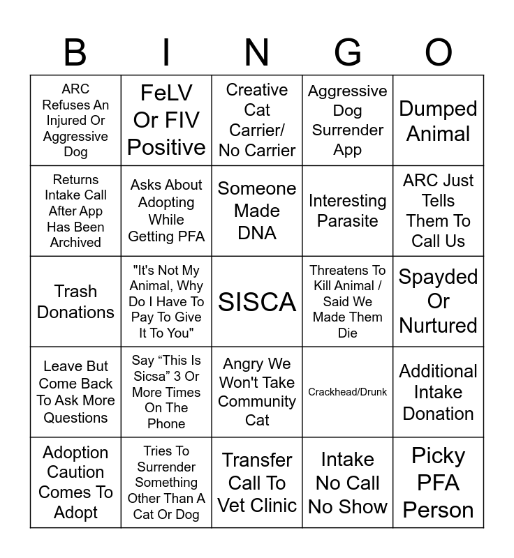 This bingo card has a free space and 30 words: Tries To Surrender Something Other Than A Cat Or Dog, Wants To "Donate" An Animal, "It's Not My Animal, Why Do I Have To Pay To Give It To You", Stolen Neonates, ARC Refuses An Injured Or Aggressive Dog, Creative Cat Carrier/ No Carrier, Asks About Adopting While Getting PFA, Angry We Won't Take Community Cat, Threatens To Kill Animal / Said We Made Them Die, Transfer Call To Vet Clinic, Spayded Or Nurtured, Picky PFA Person, Intake No Call No Show, Wants To Breed But Getting Pfa, ARC Just Tells Them To Call Us, Someone Doesn’t Shut The Bathroom Door, Crackhead/Drunk, Leave But Come Back To Ask More Questions, Say “This Is Sicsa” 3 Or More Times On The Phone, Dumped Animal, Trash Donations, $50 Or More Adoption Donation, FeLV Or FIV Positive, Interesting Parasite, Returns Intake Call After App Has Been Archived, Aggressive Dog Surrender App, Additional Intake Donation, Adoption Caution Comes To Adopt, Someone Made DNA and PFA Makes Purchase In Gift Shop.