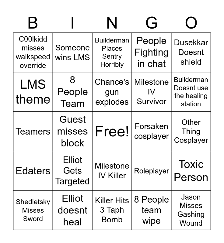This bingo card has a free space and 24 words: Elliot Gets Targeted, Elliot doesnt heal, Chance's gun explodes, Shedletsky Misses Sword, Dusekkar Doesnt shield, C00lkidd misses walkspeed override, LMS theme, Someone wins LMS, Forsaken cosplayer, Milestone IV Killer, Milestone IV Survivor, Teamers, Roleplayer, Toxic Person, 8 People Team, 8 People team wipe, Other Thing Cosplayer, Builderman Places Sentry Horribly, Builderman Doesnt use the healing station, Guest misses block, Jason Misses Gashing Wound, Edaters, People Fighting in chat and Killer Hits 3 Taph Bomb.