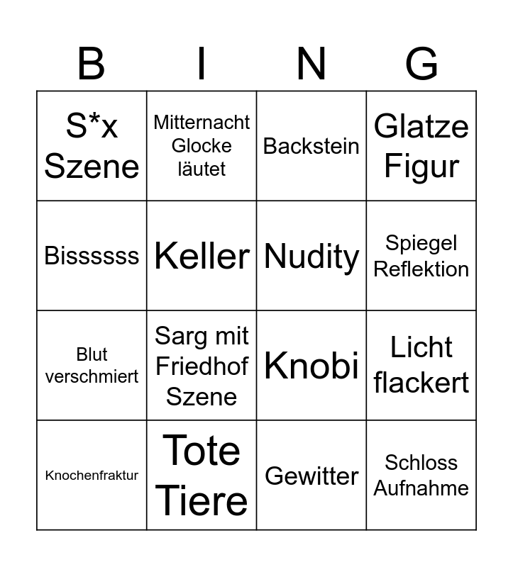 This bingo card has 16 words: Tote Tiere, Licht flackert, Backstein, S*x Szene, Blut verschmiert, Mitternacht Glocke läutet, Knobi, Gewitter, Bissssss, Keller, Knochenfraktur, Glatze Figur, Sarg mit Friedhof Szene, Spiegel Reflektion, Nudity and Schloss Aufnahme.