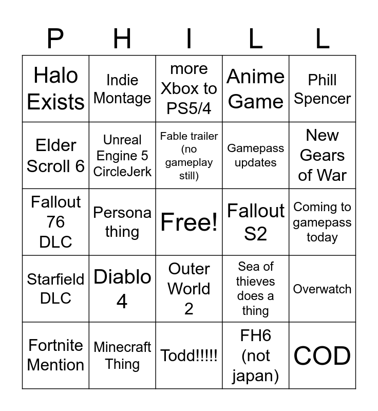 This bingo card has a free space and 24 words: Diablo 4, Minecraft Thing, Fable trailer (no gameplay still), Fortnite Mention, Phill Spencer, Halo Exists, Elder Scroll 6, Indie Montage, Fallout S2, Outer World 2, Gamepass updates, Fallout 76 DLC, Sea of thieves does a thing, Overwatch, Unreal Engine 5 CircleJerk, FH6 (not japan), Coming to gamepass today, more Xbox to PS5/4, New Gears of War, Persona thing, COD, Starfield DLC, Anime Game and Todd!!!!!.