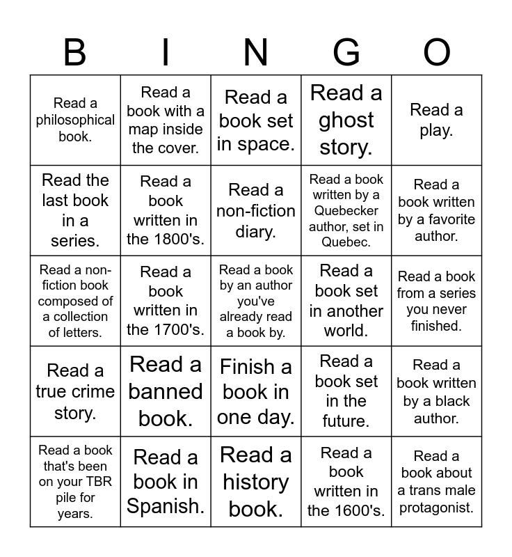 This bingo card has 25 words: Read a banned book., Read a history book., Read a non-fiction diary., Read a book that's been on your TBR pile for years., Read a play., Read a philosophical book., Read the last book in a series., Read a book with a map inside the cover., Read a book set in another world., Finish a book in one day., Read a book written by a Quebecker author, set in Quebec., Read a non-fiction book composed of a collection of letters., Read a book set in the future., Read a book written by a black author., Read a book written in the 1800's., Read a book about a trans male protagonist., Read a book from a series you never finished., Read a book set in space., Read a book written by a favorite author., Read a book written in the 1700's., Read a book by an author you've already read a book by., Read a book in Spanish., Read a true crime story., Read a ghost story. and Read a book written in the 1600's..