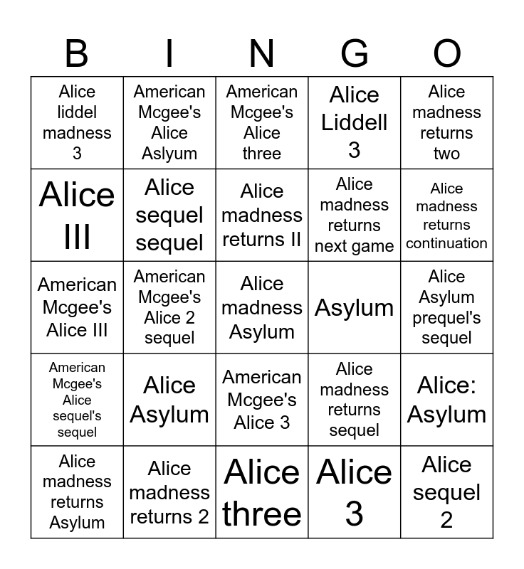 This bingo card has a free space and 24 words: Alice Asylum, Alice madness returns 2, Alice madness returns II, Alice madness returns Asylum, Alice madness returns two, Alice liddel madness 3, Alice III, American Mcgee's Alice Aslyum, Asylum, American Mcgee's Alice 3, Alice madness returns next game, American Mcgee's Alice III, Alice madness returns sequel, Alice: Asylum, Alice sequel sequel, Alice 3, Alice Asylum prequel's sequel, American Mcgee's Alice three, Alice madness returns continuation, American Mcgee's Alice 2 sequel, Alice sequel 2, American Mcgee's Alice sequel's sequel, Alice Liddell 3 and Alice three.