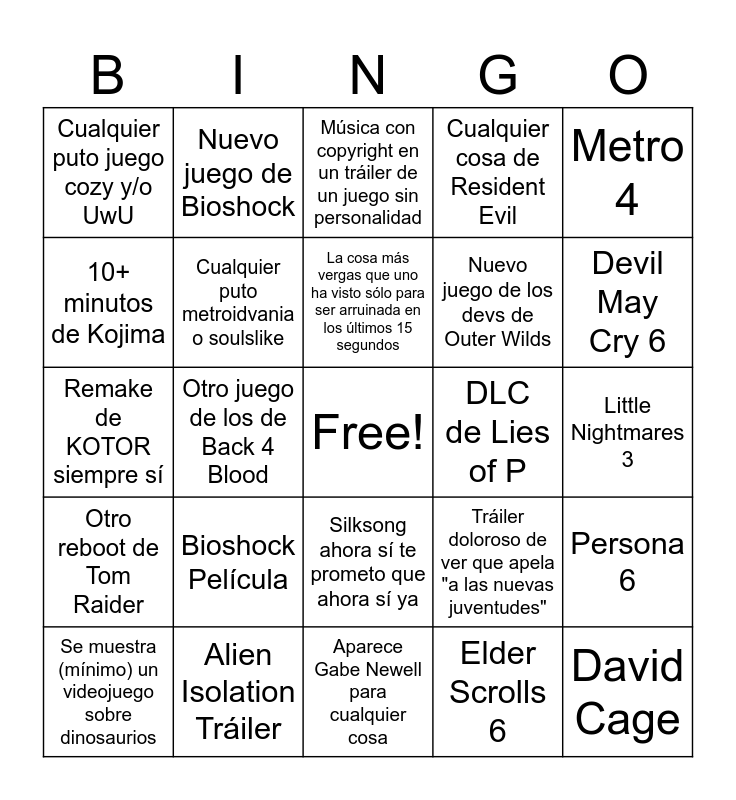 This bingo card has a free space and 24 words: Bioshock Película, Alien Isolation Tráiler, La cosa más vergas que uno ha visto sólo para ser arruinada en los últimos 15 segundos, Se muestra (mínimo) un videojuego sobre dinosaurios, Metro 4, Cualquier puto juego cozy y/o UwU, 10+ minutos de Kojima, Nuevo juego de Bioshock, DLC de Lies of P, Silksong ahora sí te prometo que ahora sí ya, Nuevo juego de los devs de Outer Wilds, Remake de KOTOR siempre sí, Tráiler doloroso de ver que apela "a las nuevas juventudes", Persona 6, Cualquier puto metroidvania o soulslike, Elder Scrolls 6, Little Nightmares 3, Música con copyright en un tráiler de un juego sin personalidad, Devil May Cry 6, Otro juego de los de Back 4 Blood, David Cage, Otro reboot de Tom Raider, Cualquier cosa de Resident Evil and Aparece Gabe Newell para cualquier cosa.