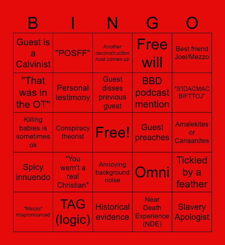 This bingo card has a free space and 29 words: "Mezzo" mispronounced, Guest wants to pray, Conspiracy theorist, Objective morality, Guest is a Calvinist, Another deconstruction host comes up, Personal testimony, "You wern't a real Christian", Guest preaches, TAG (logic), Amalekites or Canaanites, Slavery Apologist, Historical evidence, Near Death Experience (NDE), "S'IDACMAC BIFTTOJ", Bjorn, Annoying background noise, Spicy innuendo, Best friend Joel/Mezzo, Killing babies is sometimes ok, Omni, Guest gets muted, BBD podcast mention, "That was in the OT", Free will, "POSFF", Tickled by a feather, Guest disses previous guest and Guest crashes out.