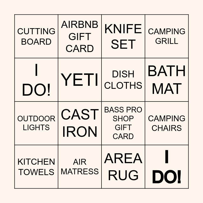 This bingo card has 16 words: AIR MATRESS, CAMPING CHAIRS, KNIFE SET, CUTTING BOARD, OUTDOOR LIGHTS, AIRBNB GIFT CARD, BASS PRO SHOP GIFT CARD, AREA RUG, I DO!, YETI, KITCHEN TOWELS, CAMPING GRILL, CAST IRON, BATH MAT, DISH CLOTHS and I DO!.