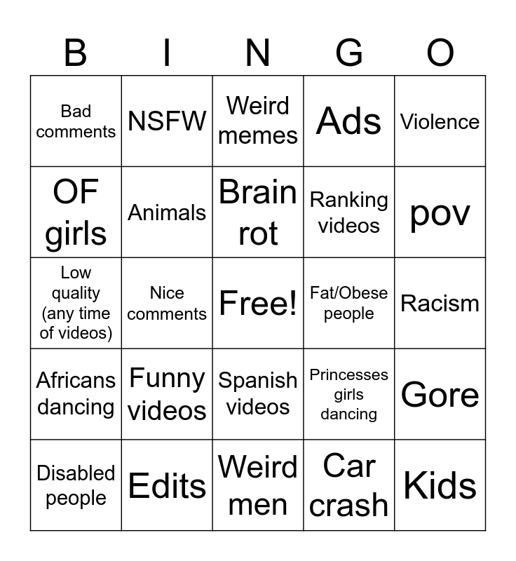 This bingo card has a free space and 24 words: Disabled people, Funny videos, Brain rot, Car crash, Violence, Bad comments, NSFW, Weird memes, Fat/Obese people, Racism, Low quality (any time of videos), Animals, Princesses girls dancing, Gore, OF girls, Edits, Weird men, Ads, pov, Africans dancing, Nice comments, Spanish videos, Ranking videos and Kids.
