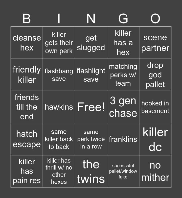 This bingo card has a free space and 59 words: boon perk, killer has thrill w/ no other hexes, crawl out exit while slugged, hatch escape, successful pallet/window fake, successful sabo, flashbang save, 2+ perks from same character, matching perks w/ team, ttv, killer has a hex, get moried, friendly killer, 4 out, everyone dies, cleanse hex, no mither, scene partner, invocation, flashlight save, 3 gen chase, get slugged, killer has pain res, killer dc, conflicting perks, get hit while exposed, successfully hide in a locker, complete a gen solo, drop god pallet, face camped, 2+ healing perks, 4% off hook, accidental sandbag, killer bm, killer gets their own perk, lightborn, >2% pick rate killer, hawkins, chucky, friends till the end, NOED, same killer back to back, hooked in basement, perk from character you're playing as, pop gen in killer's face, finish main building gen, plot twist, midwich, same perk twice in a row, the twins, billy, FREE!, earn 20,000+ BP, endgame perk, universal perk, franklins, escape on death hook, make the killer give up chase and favorite perk.