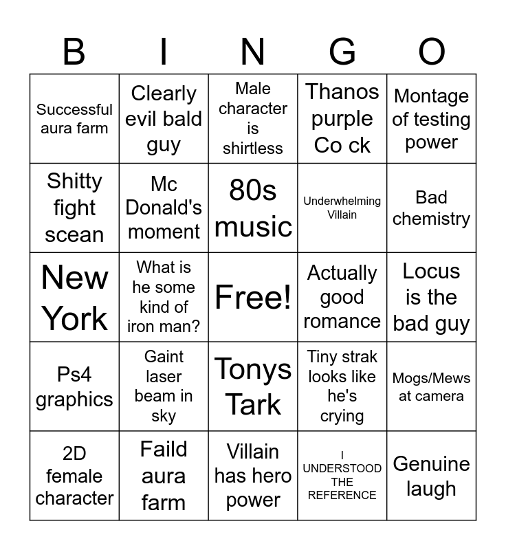 This bingo card has a free space and 24 words: Gaint laser beam in sky, Faild aura farm, 80s music, 2D female character, Montage of testing power, Successful aura farm, Shitty fight scean, Clearly evil bald guy, Actually good romance, Tonys Tark, Underwhelming Villain, New York, Tiny strak looks like he's crying, Mogs/Mews at camera, Mc Donald's moment, I UNDERSTOOD THE REFERENCE, Locus is the bad guy, Male character is shirtless, Bad chemistry, What is he some kind of iron man?, Genuine laugh, Ps4 graphics, Thanos purple Co ck and Villain has hero power.