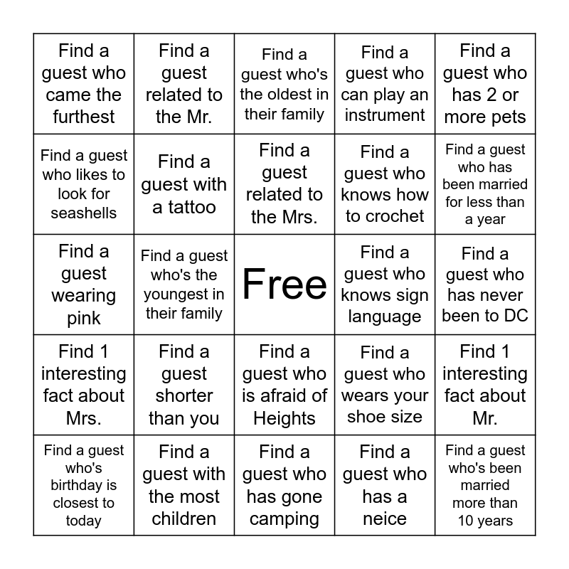 This bingo card has a free space and 24 words: Find a guest shorter than you, Find a guest with the most children, Find a guest related to the Mrs., Find a guest who's birthday is closest to today, Find a guest who has 2 or more pets, Find a guest who came the furthest, Find a guest who likes to look for seashells, Find a guest related to the Mr., Find a guest who knows sign language, Find a guest who is afraid of Heights, Find a guest who knows how to crochet, Find a guest wearing pink, Find a guest who wears your shoe size, Find 1 interesting fact about Mr., Find a guest with a tattoo, Find a guest who has a neice, Find a guest who has never been to DC, Find a guest who's the oldest in their family, Find a guest who has been married for less than a year, Find a guest who's the youngest in their family, Find a guest who's been married more than 10 years, Find 1 interesting fact about Mrs., Find a guest who can play an instrument and Find a guest who has gone camping.