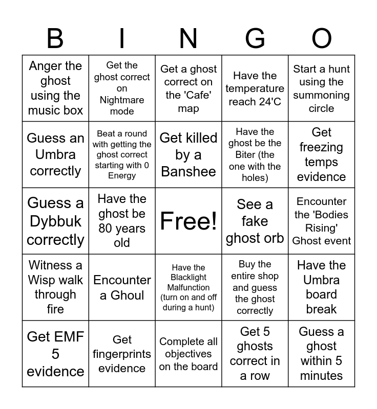 This bingo card has a free space and 24 words: Get EMF 5 evidence, Encounter a Ghoul, Get killed by a Banshee, Get 5 ghosts correct in a row, Start a hunt using the summoning circle, Anger the ghost using the music box, Get the ghost correct on Nightmare mode, Get a ghost correct on the 'Cafe' map, See a fake ghost orb, Encounter the 'Bodies Rising' Ghost event, Guess a Dybbuk correctly, Beat a round with getting the ghost correct starting with 0 Energy, Buy the entire shop and guess the ghost correctly, Have the Umbra board break, Guess an Umbra correctly, Get fingerprints evidence, Complete all objectives on the board, Have the temperature reach 24'C, Get freezing temps evidence, Witness a Wisp walk through fire, Have the ghost be 80 years old, Have the Blacklight Malfunction (turn on and off during a hunt), Have the ghost be the Biter (the one with the holes) and Guess a ghost within 5 minutes.