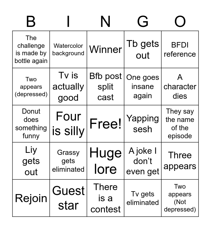 This bingo card has a free space and 24 words: Grassy gets eliminated, Guest star, Bfb post split cast, Rejoin, BFDI reference, The challenge is made by bottle again, Two appears (depressed), Watercolor background, Yapping sesh, Huge lore, One goes insane again, Donut does something funny, A joke I don’t even get, Three appears, Tv is actually good, Tv gets eliminated, They say the name of the episode, Winner, A character dies, Four is silly, Two appears (Not depressed), Liy gets out, Tb gets out and There is a contest.