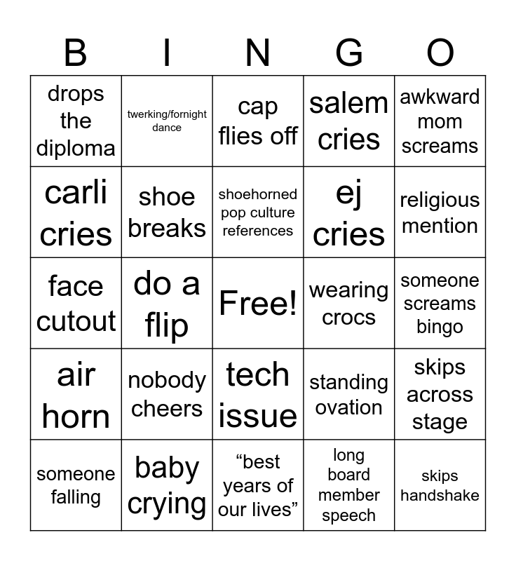 This bingo card has a free space and 29 words: someone falling, someone passing out, do a flip, mispronounced name, drops the diploma, cap flies off, shoe breaks, nobody cheers, wearing crocs, baby crying, someone screams bingo, skips handshake, “best years of our lives”, long board member speech, religious mention, gown not zipped, tech issue, air horn, awkward mom screams, face cutout, standing ovation, issues with flag, ej cries, carli cries, salem cries, twerking/fornight dance, skips across stage, shoehorned pop culture references and strut across stage.