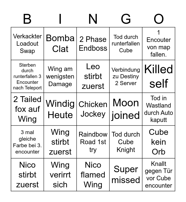 This bingo card has a free space and 24 words: Wing stirbt zuerst, Wing verirrt sich, Leo stirbt zuerst, Nico stirbt zuerst, 1 Encouter von map fallen., Verkackter Loadout Swap, Sterben durch runterfallen 3 Encounter nach Teleport, Bomba Clat, Moon joined, Raindbow Road 1st try, Verbindung zu Destiny 2 Server, 2 Tailed fox auf Wing, Tod durch Cube Knight, Cube kein Orb, Wing am wenigsten Damage, Super missed, Tod in Wastland durch Auto kaputt, 2 Phase Endboss, Killed self, Windig Heute, Knallt gegen Tür vor Cube encounter, 3 mal gleiche Farbe bei 3. encounter, Tod durch runterfallen Cube and Nico flamed Wing.
