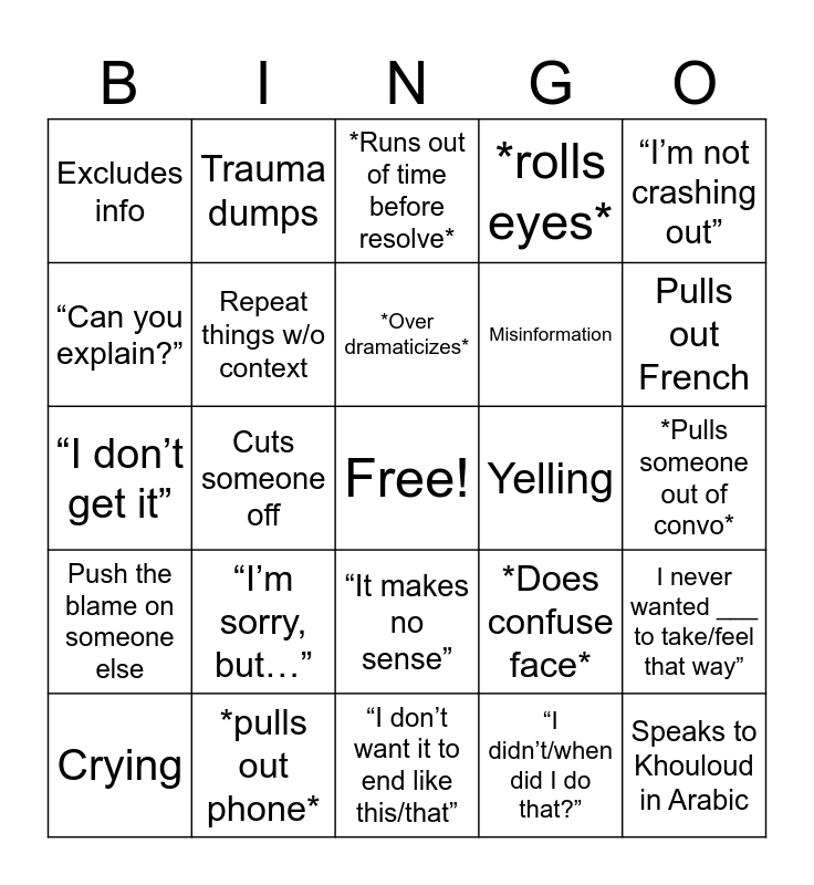 This bingo card has a free space and 24 words: “I’m sorry, but…”, *pulls out phone*, *Over dramaticizes*, Crying, “I’m not crashing out”, Excludes info, “Can you explain?”, Trauma dumps, Yelling, “It makes no sense”, Misinformation, “I don’t get it”, *Does confuse face*, I never wanted ___ to take/feel that way”, Repeat things w/o context, “I didn’t/when did I do that?”, *Pulls someone out of convo*, *Runs out of time before resolve*, Pulls out French, Cuts someone off, Speaks to Khouloud in Arabic, Push the blame on someone else, *rolls eyes* and “I don’t want it to end like this/that”.