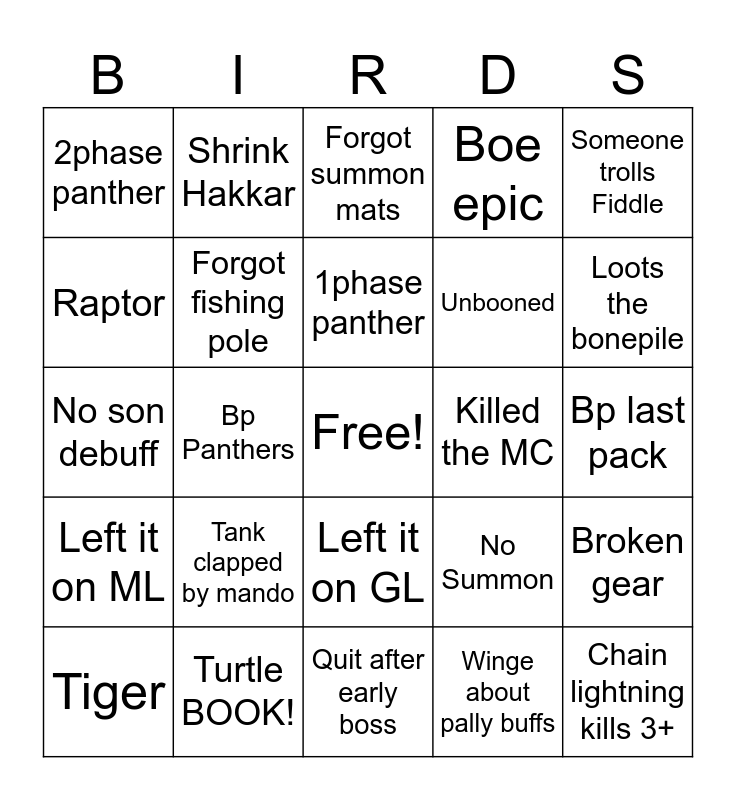 This bingo card has a free space and 29 words: Tiger, Wipe, Bp Panthers, Bp Berserker, 2phase panther, Forgot summon mats, Forgot fishing pole, Tank clapped by mando, Killed the MC, Turtle BOOK!, Bp last pack, Chain lightning kills 3+, Quit after early boss, Winge about pally buffs, Loots the bonepile, "let's try a new strat", Left it on GL, Left it on ML, Someone trolls Fiddle, No son debuff, No Summon, Missing a class buff, Unbooned, Raptor, Boe epic, Shrink Hakkar, Broken gear, 1phase panther and Needs summon on Hakkar.