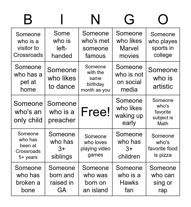 This bingo card has a free space and 24 words: Someone who has 3+ siblings, Someone born and raised in GA, Someone with the same birthday month as you, Someone who has broken a bone, Someone who playes sports in college, Someone who is a visitor to Crossroads, Someone who has a pet at home, Some who is left-handed, Someone who likes waking up early, Someone who loves playing video games, Someone who is not on social media, Someone who's an only child, Someone who has 3+ children, Someone who's favorite food is pizza, Someone who likes to dance, Someone who is a Hawks fan, Someone who's favorite subject is Math, Someone who's met someone famous, Someone who is artistic, Someone who is a preacher, Someone who can sing or rap, Someone who has been at Crossroads 5+ years, Someone who likes Marvel movies and Someone who was born on an island.