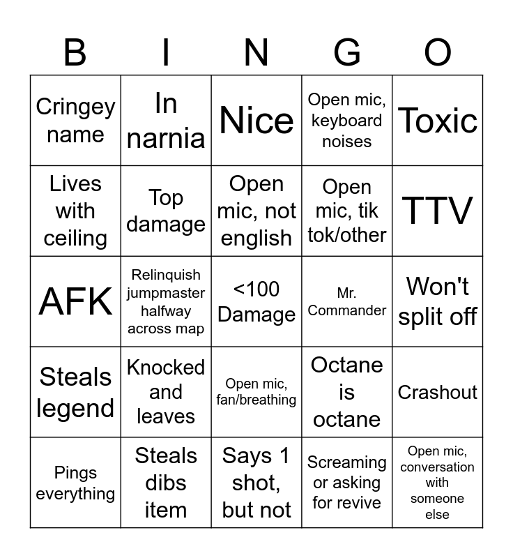 This bingo card has a free space and 24 words: Knocked and leaves, Steals dibs item, Open mic, not english, Pings everything, Toxic, Cringey name, Lives with ceiling, In narnia, Mr. Commander, Open mic, fan/breathing, Open mic, tik tok/other, AFK, Octane is octane, Crashout, Top damage, Screaming or asking for revive, Won't split off, Nice, TTV, Relinquish jumpmaster halfway across map, Open mic, conversation with someone else, Steals legend, Open mic, keyboard noises and Says 1 shot, but not.
