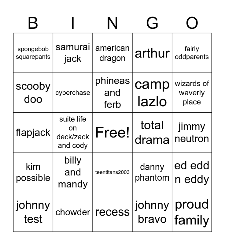 This bingo card has a free space and 24 words: billy and mandy, chowder, phineas and ferb, johnny test, fairly oddparents, spongebob squarepants, scooby doo, samurai jack, total drama, teentitans2003, camp lazlo, flapjack, danny phantom, ed edd n eddy, cyberchase, johnny bravo, jimmy neutron, american dragon, wizards of waverly place, suite life on deck/zack and cody, proud family, kim possible, arthur and recess.