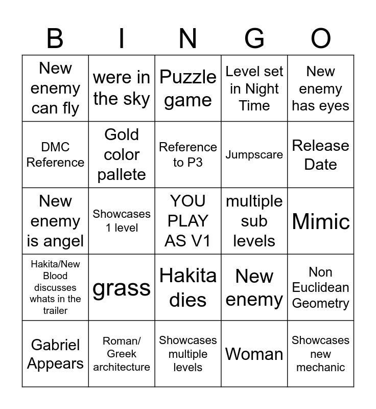 This bingo card has a free space and 24 words: grass, Roman/ Greek architecture, Reference to P3, Gabriel Appears, New enemy has eyes, New enemy can fly, DMC Reference, were in the sky, multiple sub levels, Hakita dies, Jumpscare, New enemy is angel, New enemy, Non Euclidean Geometry, Gold color pallete, Woman, Mimic, Puzzle game, Release Date, Showcases 1 level, Showcases new mechanic, Hakita/New Blood discusses whats in the trailer, Level set in Night Time and Showcases multiple levels.