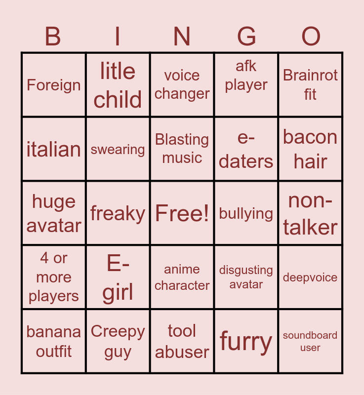 This bingo card has a free space and 24 words: E-girl, Creepy guy, Blasting music, banana outfit, Brainrot fit, Foreign, italian, litle child, bullying, anime character, e-daters, huge avatar, disgusting avatar, deepvoice, swearing, furry, non-talker, voice changer, bacon hair, freaky, soundboard user, 4 or more players, afk player and tool abuser.
