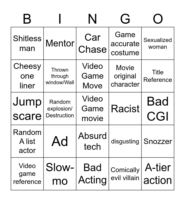 This bingo card has a free space and 24 words: Ad, Slow-mo, Video Game Move, Video game reference, Sexualized woman, Shitless man, Cheesy one liner, Mentor, Racist, Absurd tech, Movie original character, Jump scare, disgusting, Snozzer, Thrown through window/Wall, Comically evil villain, Bad CGI, Car Chase, Title Reference, Random explosion/ Destruction, A-tier action, Random A list actor, Game accurate costume and Bad Acting.